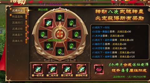 开服第4天开启武魂转盘活动,转动转盘可以抽取武魂玄晶,武略装备残页-诛仙阵,完成四轮转盘集齐5个残页可以合成完整武略装备-诛仙阵(麻痹+抗麻痹唯一神器)